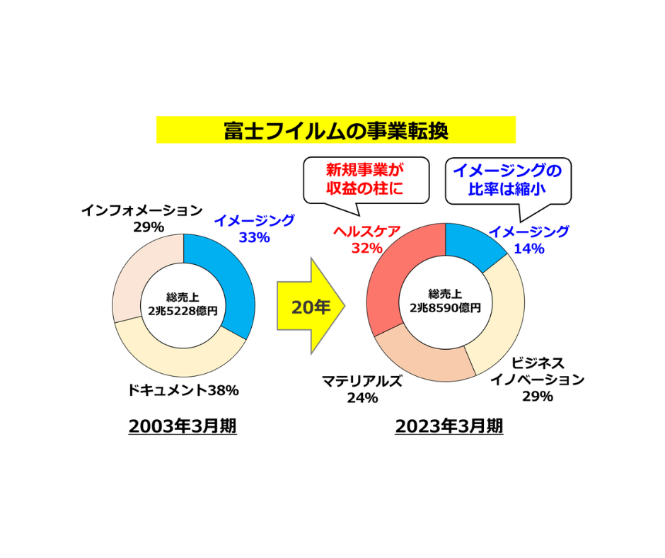 デジカメが主流になってきてフィルムが売れなくなっちゃうから、培ってきた写真技術を医療・ヘルスケア分野へ活用して、事業転換に成功するって感じですね。