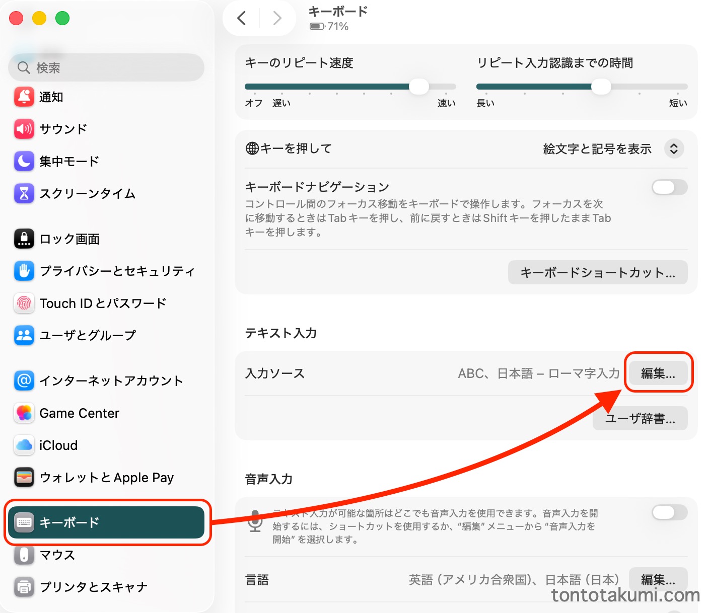 左側にあるメニューをスクロールしていくと、【キーボード】の項目があるのでクリックすると、右側部分に【テキスト入力】が表示されるので、【入力ソース」の右側にある【編集】をクリック。