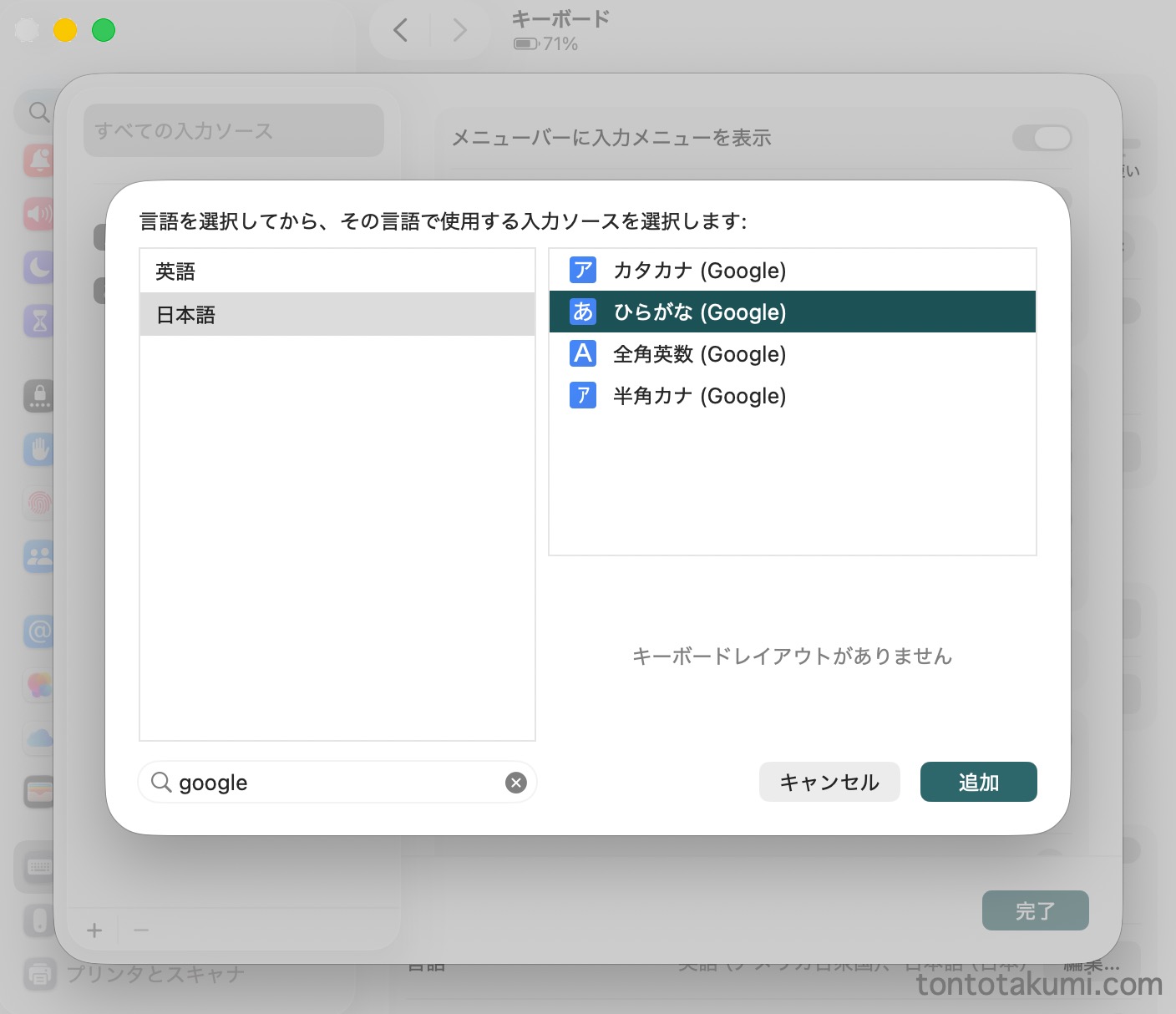入力ソースを追加で選択をするときに、左下の検索枠に「google」を入力してあげるところがポイントですね。