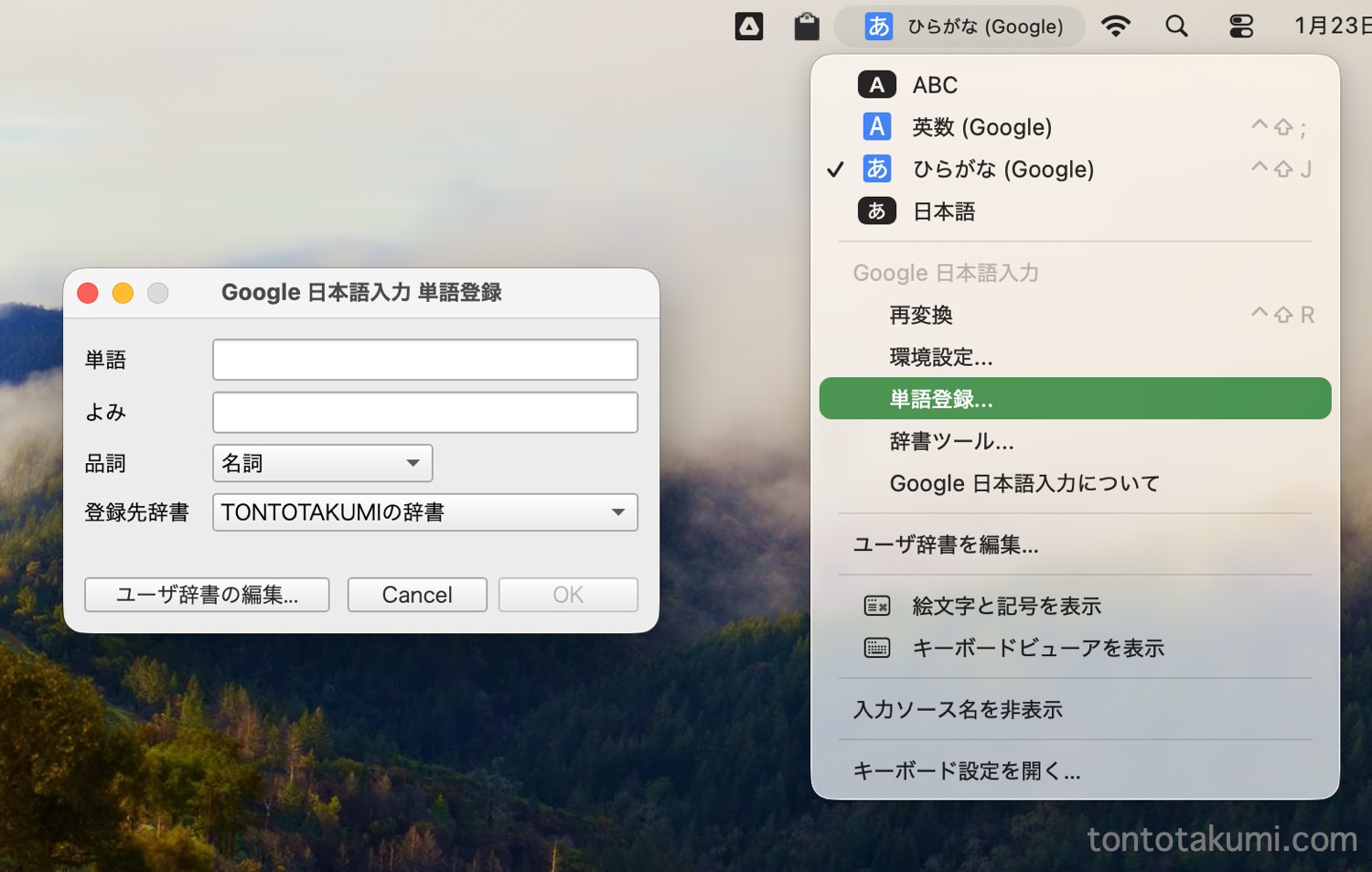 【Google日本語入力】を利用しているときに、右上の表示をクリックすると、[単語登録]と[辞書ツール]という項目が表示されます。