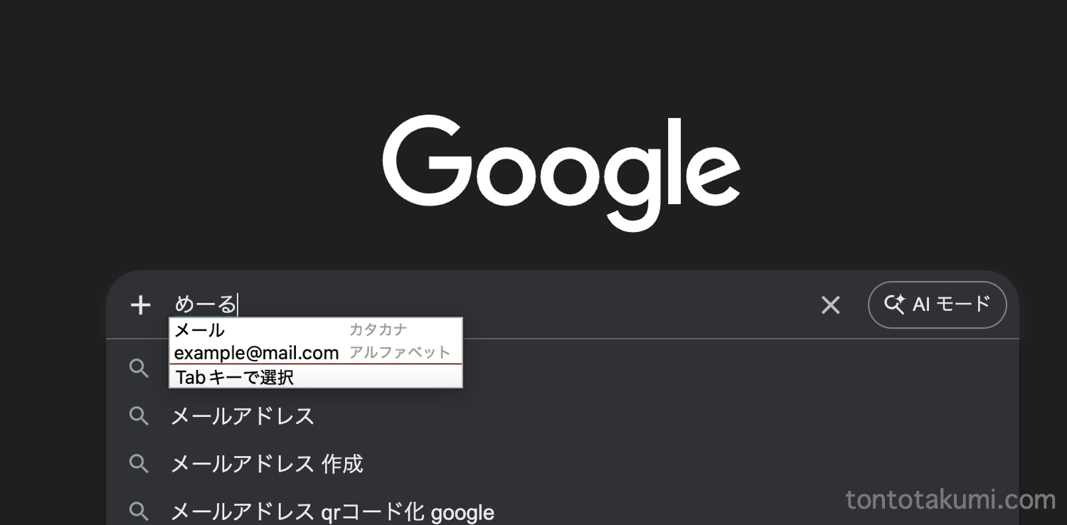 テキスト入力時に、【よみ】の「めーる」を入力すると、予測変換部分に【単語】の「example@mail.com」がすぐに出てくるようになります。