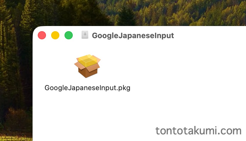 ダウンロードした[GoogleJapaneseInput.dmg]を開くと、[GoogleJapaneseInput.pkg]が別ウィンドウで表示されるので、クリック。