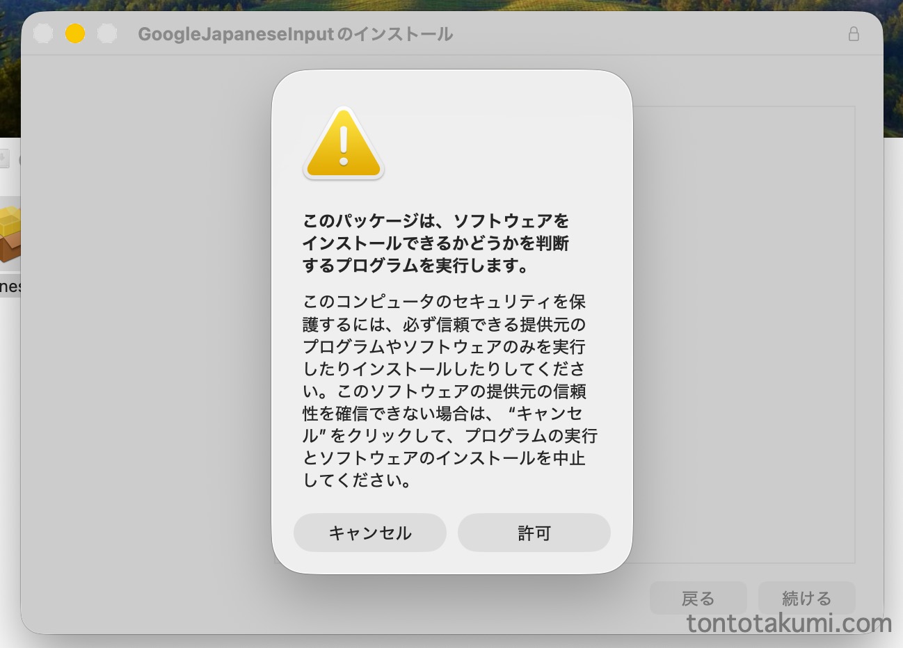 (何度か表示されましたが、【許可】したら次のインストール画面が表示されました。)